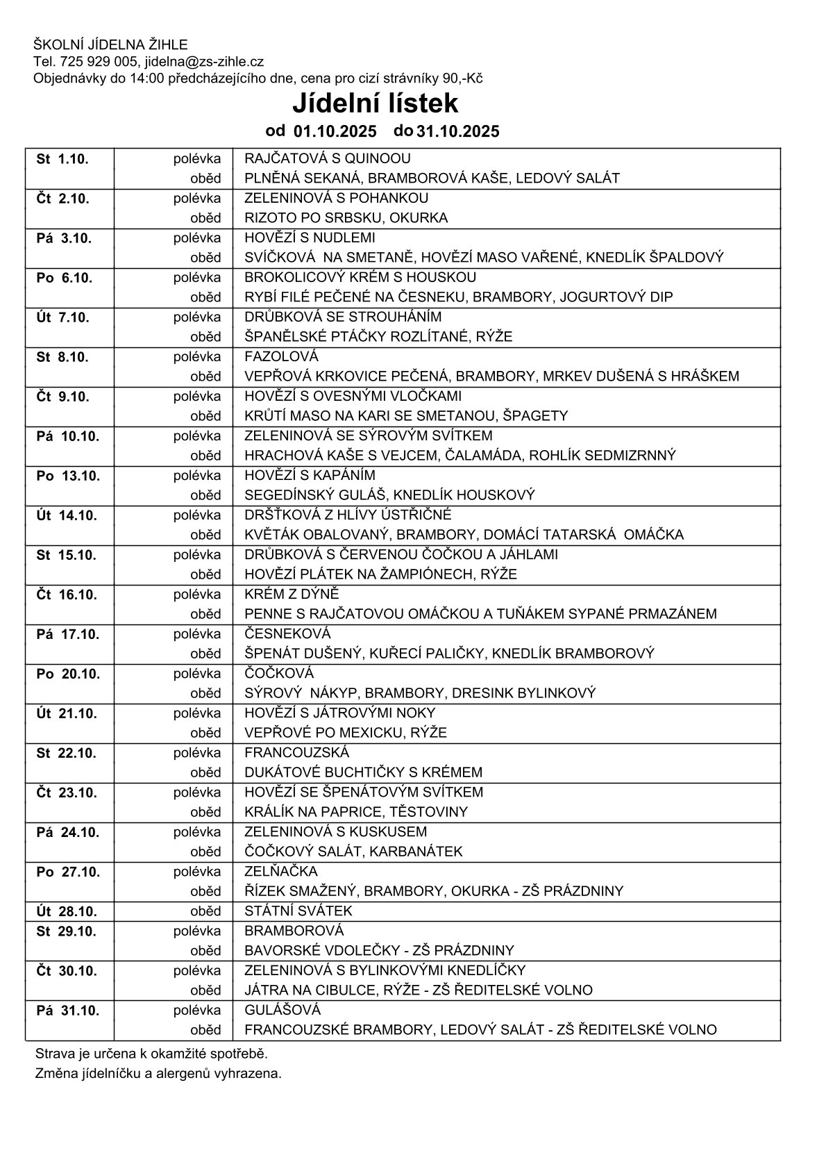 Změna jídelníčku a alergenů vyhrazena.