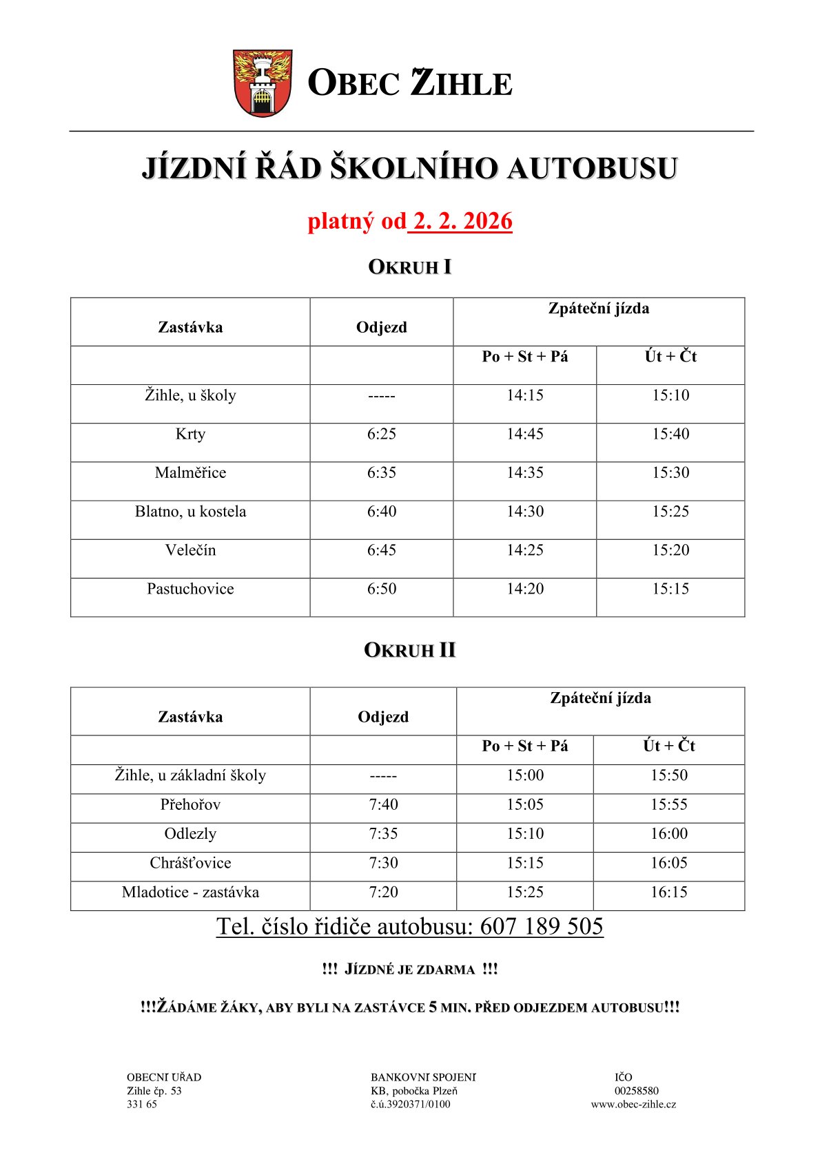 Jízdní řád školního autobusu (platný od 2. 2. 2026)