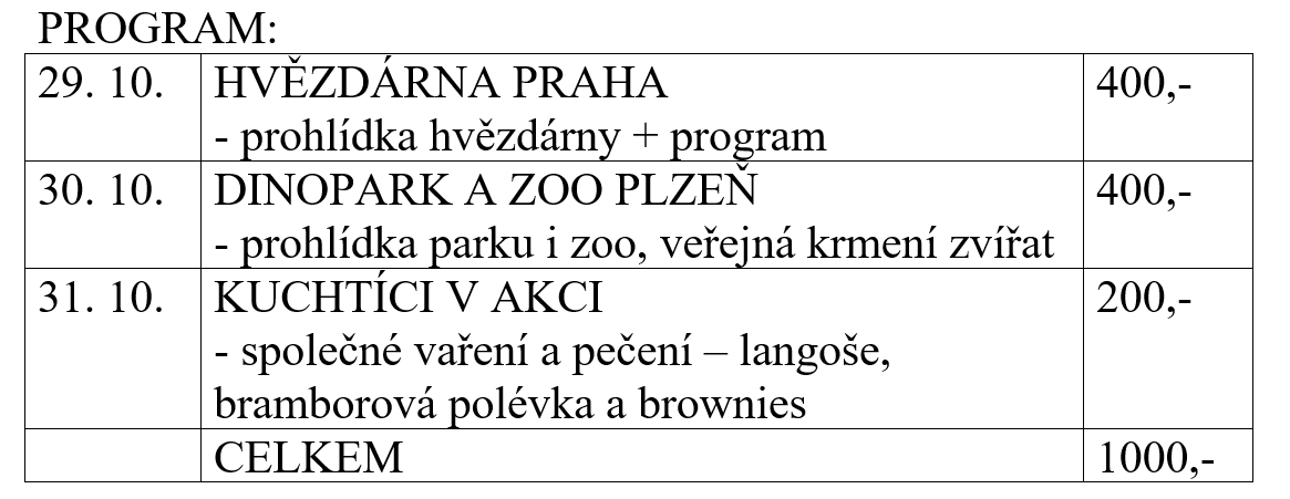 Přihlášení na akci je pouze online přes systém Domeček nejpozději do 23. 10. 2025 + uhradit poplatek. Podrobné informace o odjezdu a příjezdu v jednotlivé dny obdržíte po přihlášení.